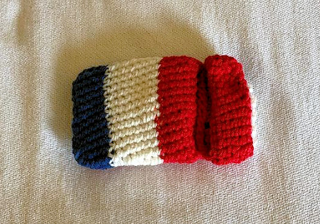 Back to the tote: When I took the tote for a spin around town I realized the inside is just one big hole, and worried what would happen if my keys met my cell phone? So, I made a little cell phone cozy using left over yarn. The yarn is Red Heart’s SuperSaver, and I think the colorway is called “Americana” (likely discontinued). Obviously, it’s a red, white and blue self-striping yarn. Surprisingly, this is how the colors worked out! No yarn gymnastics needed!