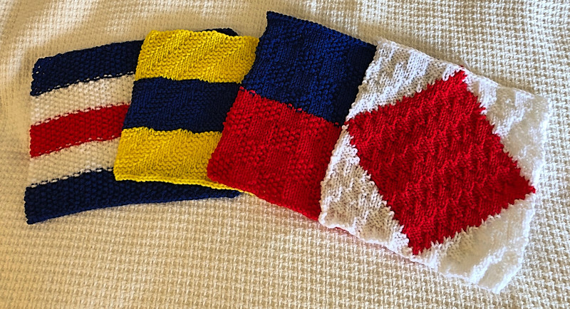 I’m more or less halfway done, with 12 completed squares: Charlie, Echo, Delta, Foxtrot, Golf, Hotel, India, Juliette, Kilo, Lima, Mike, and Papa. I’ve had some struggles. After trying three with different patterns, I’m finally happy with Foxtrot (red diamond on white). I was a bit over halfway through with Lima (yellow and black squares) when I realized I had the colors backward. I thought I could just turn it upside down, so I kept going. Except that: only three rows from completion I discovered turning it upside down does nothing to change the color layout. And since the knitting pattern I used has a back and front, I can’t turn it around.