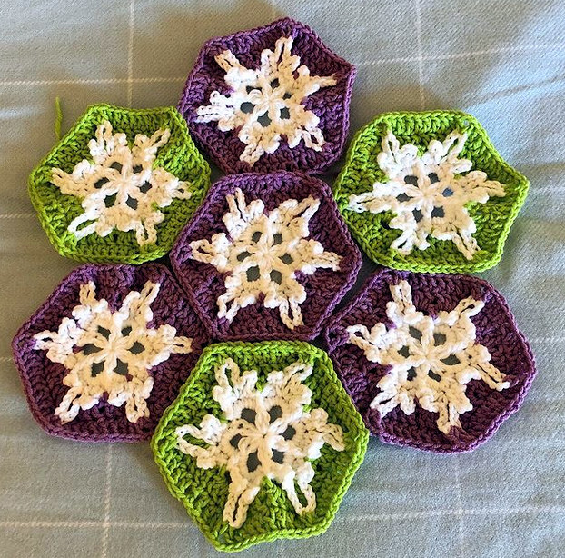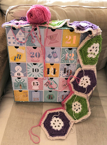 Day 2 added a purple background around four of the motifs. That’s when I realized I’d messed up one of the snowflakes. Worse, I couldn’t unravel it. Fortunately, I had leftover yarn and made another one. But I fell behind.